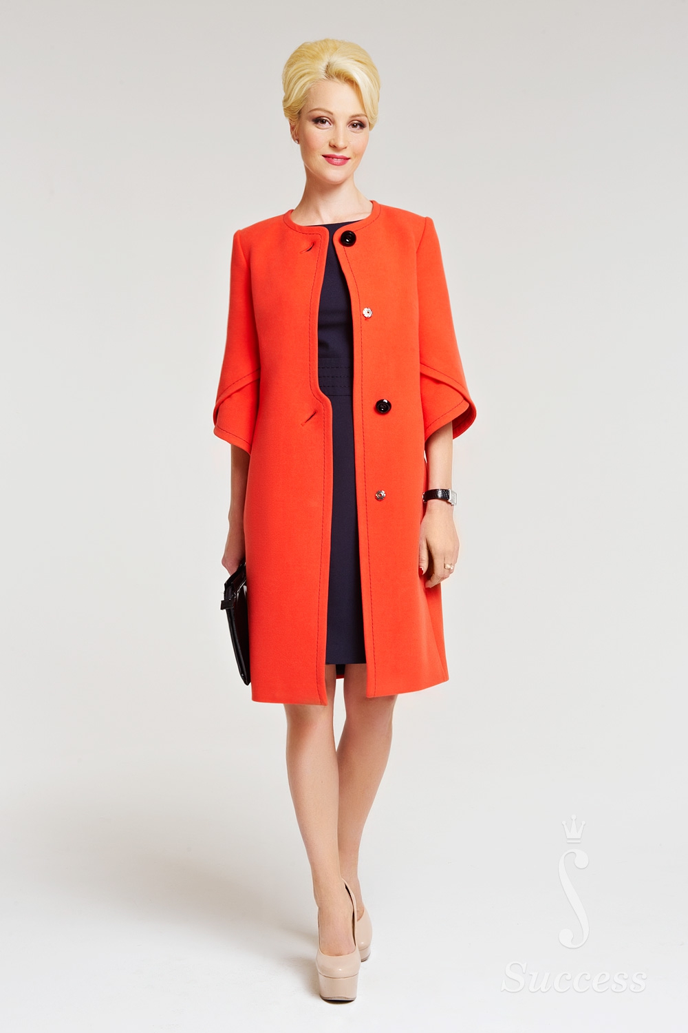 Пальто с рукавами 3/4, без воротника. Модель полупрямого силуэта, дополнена скрытой застежкой на кнопки и двумя пуговицами.